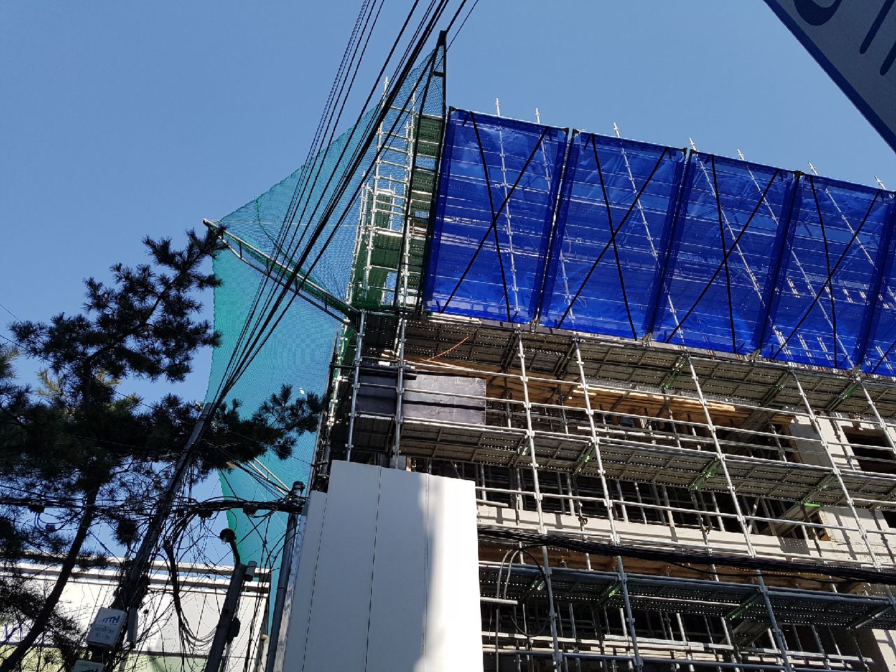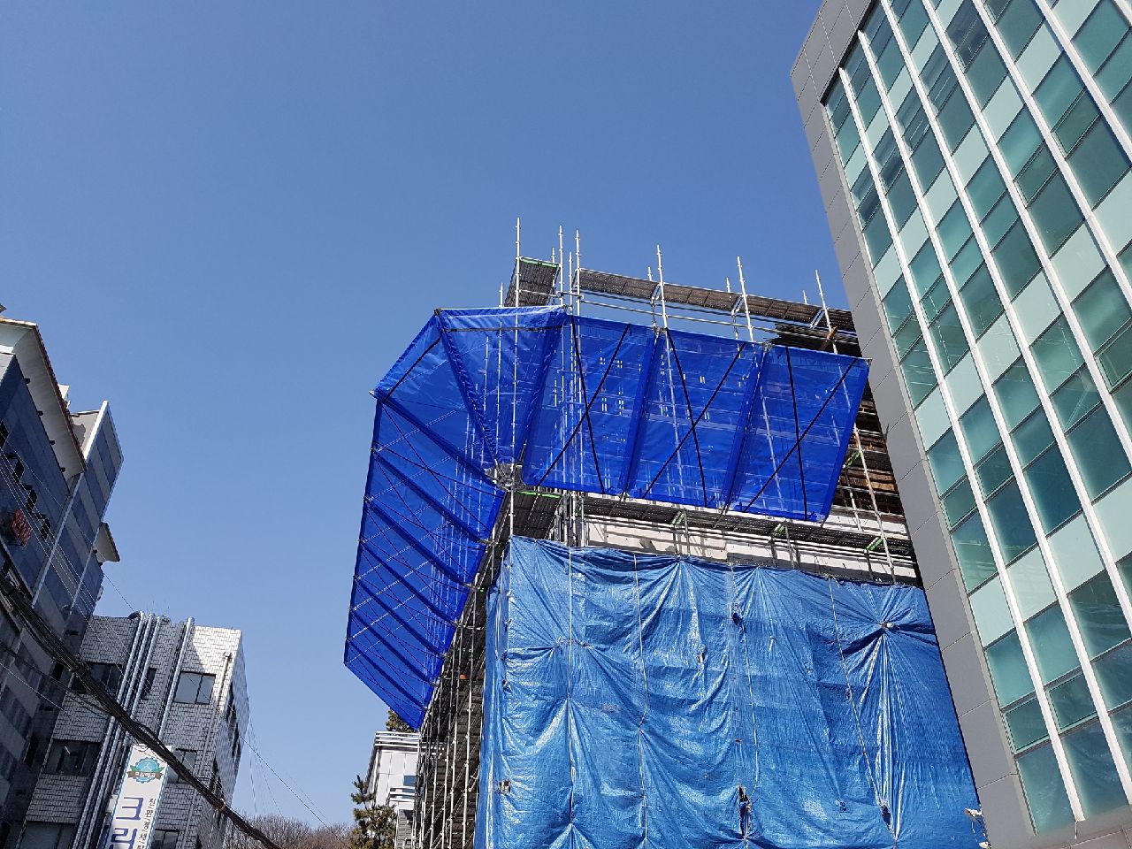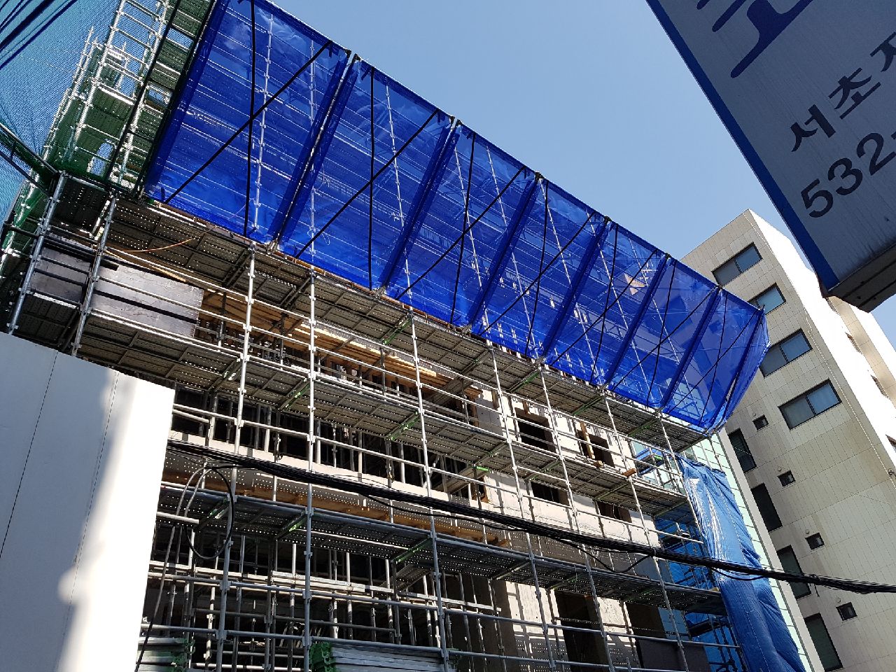 서울특별시 서초구 도심한복판 도로변/인도 바로옆 공사현장 비계설치와 인도변의 공사면과 주차장공사면은 방염틀로 시공하였으며 건물과 건물사이는 플라잉네트로 시공하였습니다 공사비를 최대한 저렴하게 하기위한 방법이였습니다.